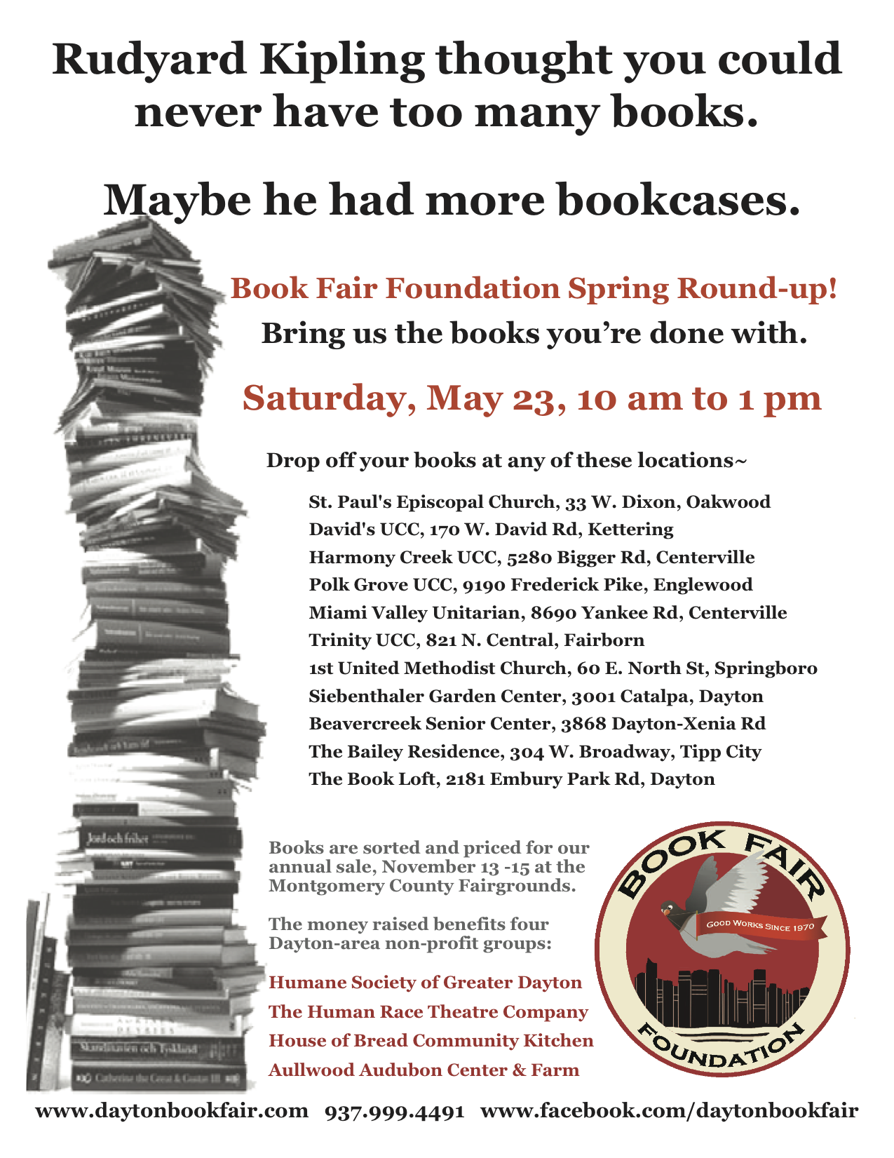 It’s the Great Book Round Up Charlie Brown! Next Saturday, from 10 in the morning until 1 p.m., the Book Fair Foundation will have “Book Drops” at various sites around town. If you’ve got too many books, we’ll gladly take your extras! Books are sold at our sale at Montgomery County Fairgrounds November 13-15 to benefit four Dayton area non-profits– Humane Society of Greater Dayton, The Human Race Theatre Company, Aullwood Audubon Center and Farm and the House of Bread Community Kitchen. Please, please share this with your Dayton area friends. Let’s get the word out to get the books in!
