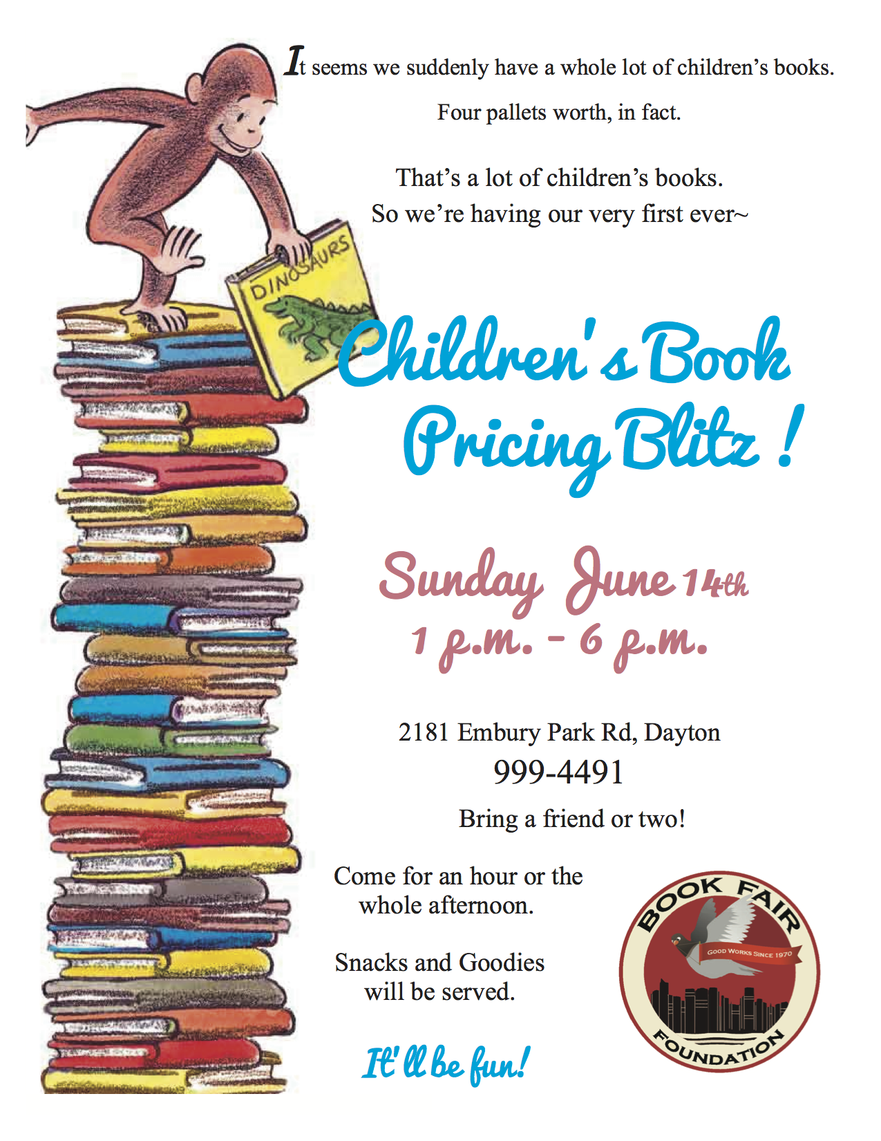 Next Sunday, June 14th, we’re having a children’s book-pricing event at the Book Loft. Dayton-area friends if you’d like to come and help, that would be Awesome. There will be snacks and pizza and the like, and it’s actually a lot of fun to go through all these children’s books. You’re welcome to take a few home with you too. If you just want to come out and be social on a Sunday afternoon, we’d love to see you. Call 937.999.4491 for more info.