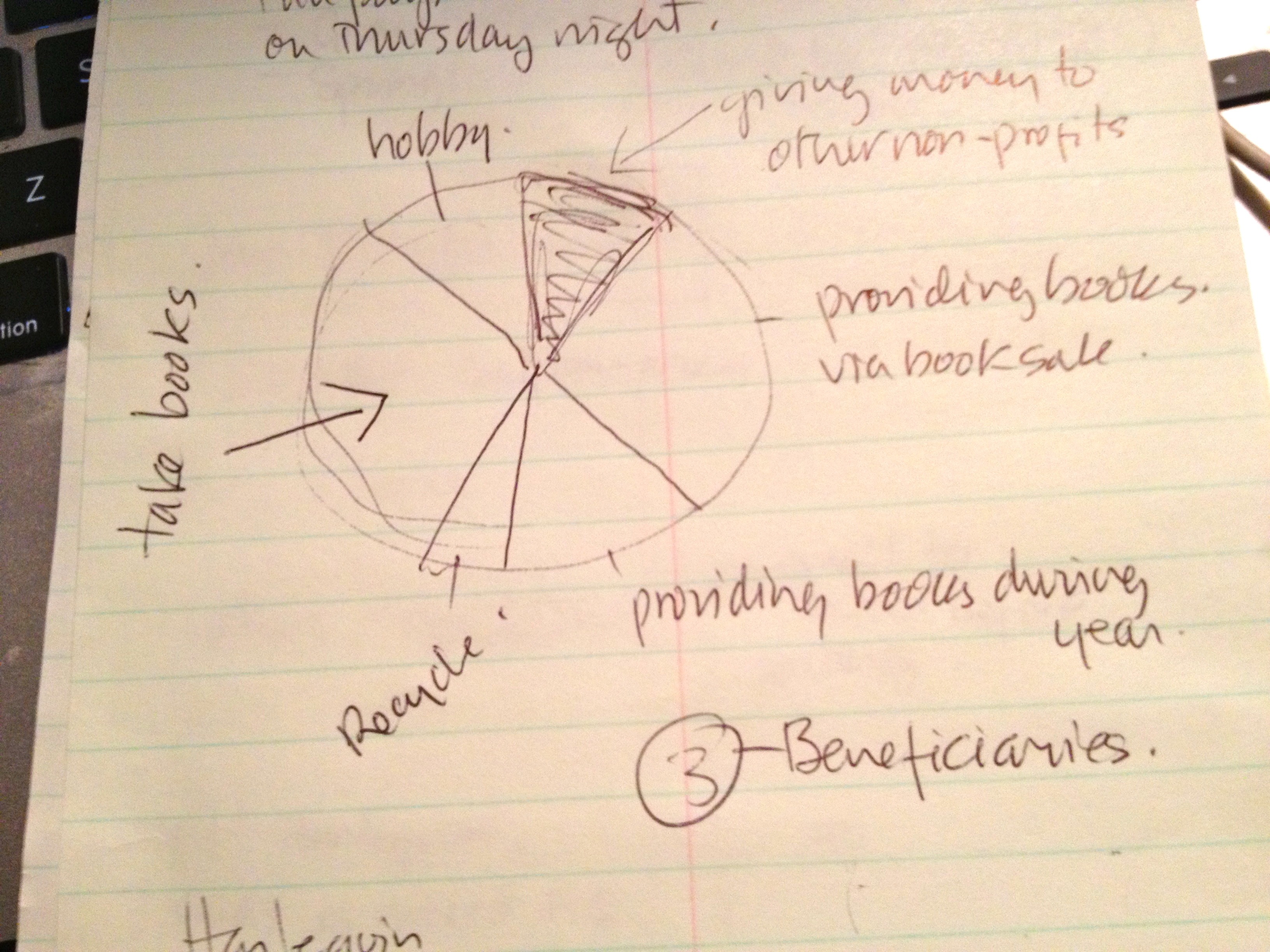 In addition, we provide books for free throughout the year– to schools, literacy programs, clinics, community kitchens, other non-profits and the like. This past year we gave away around 400 cases, or about seven tons of books. At the end of the sale we gave away 20 more tons of books, some of which went to a literacy program and the rest went a recycling program run by developmentally challenged students at Meadowdale High School. Between donations (17%) and recycling (8%), that accounts for another chunk of pie.