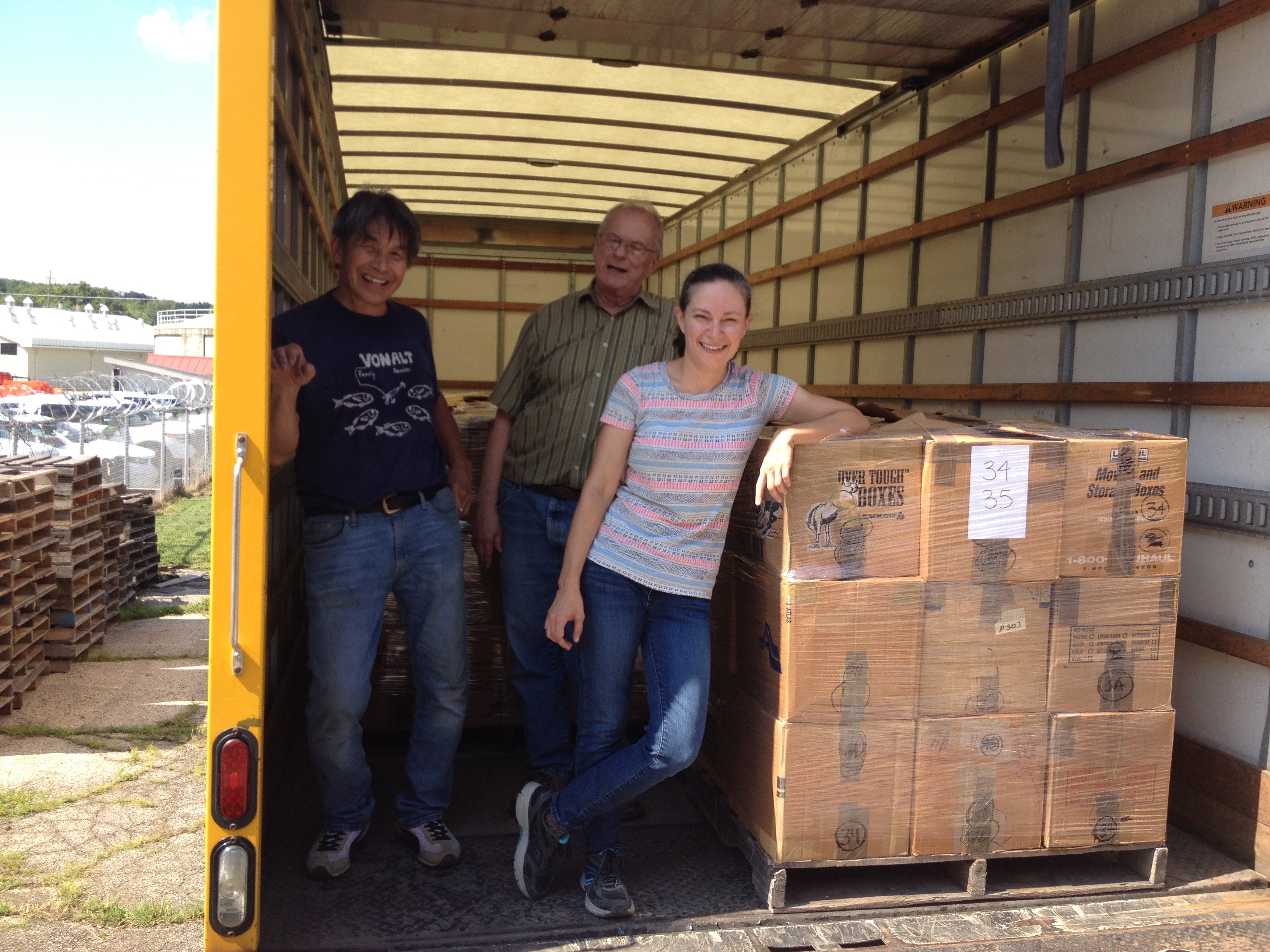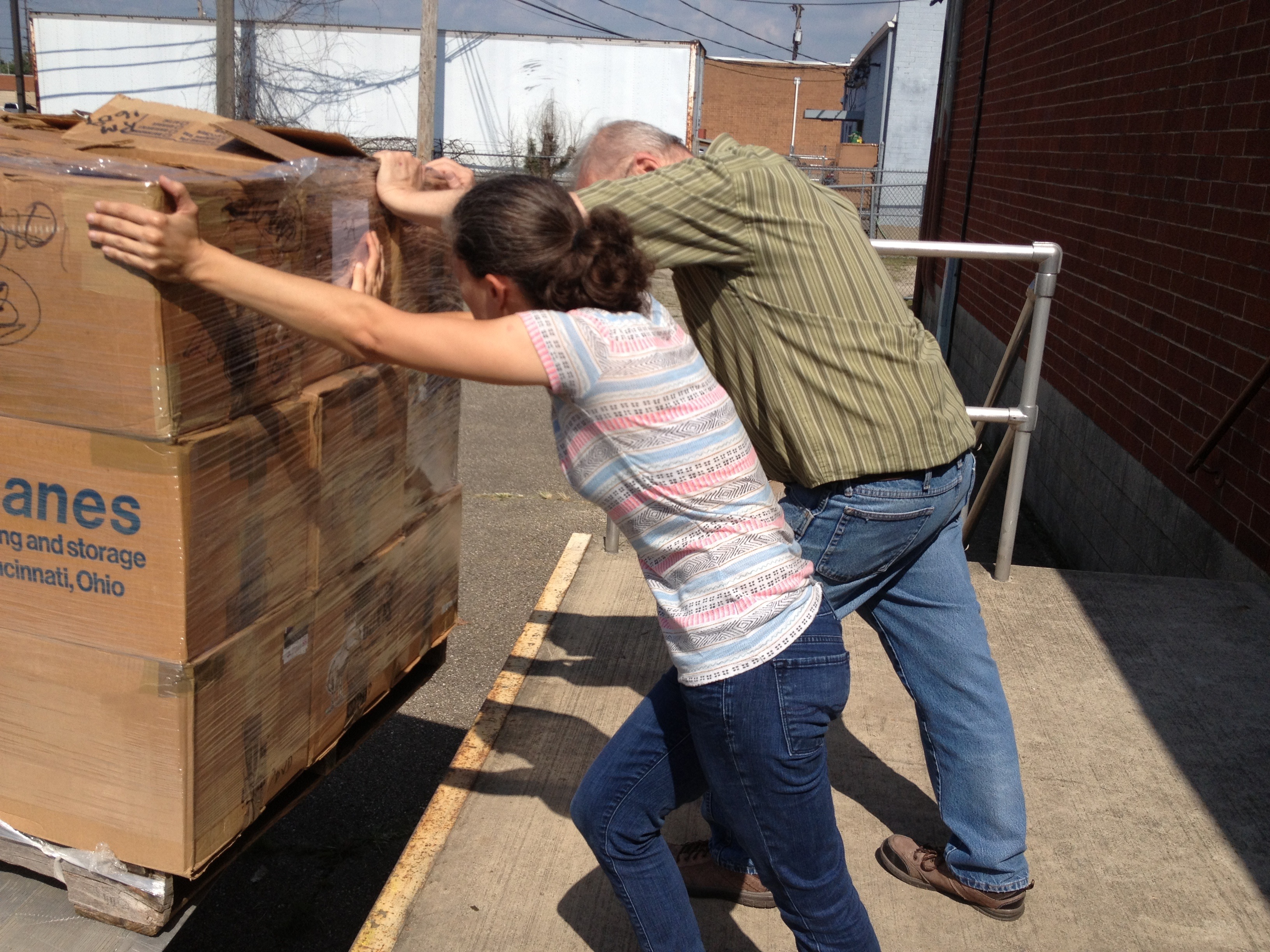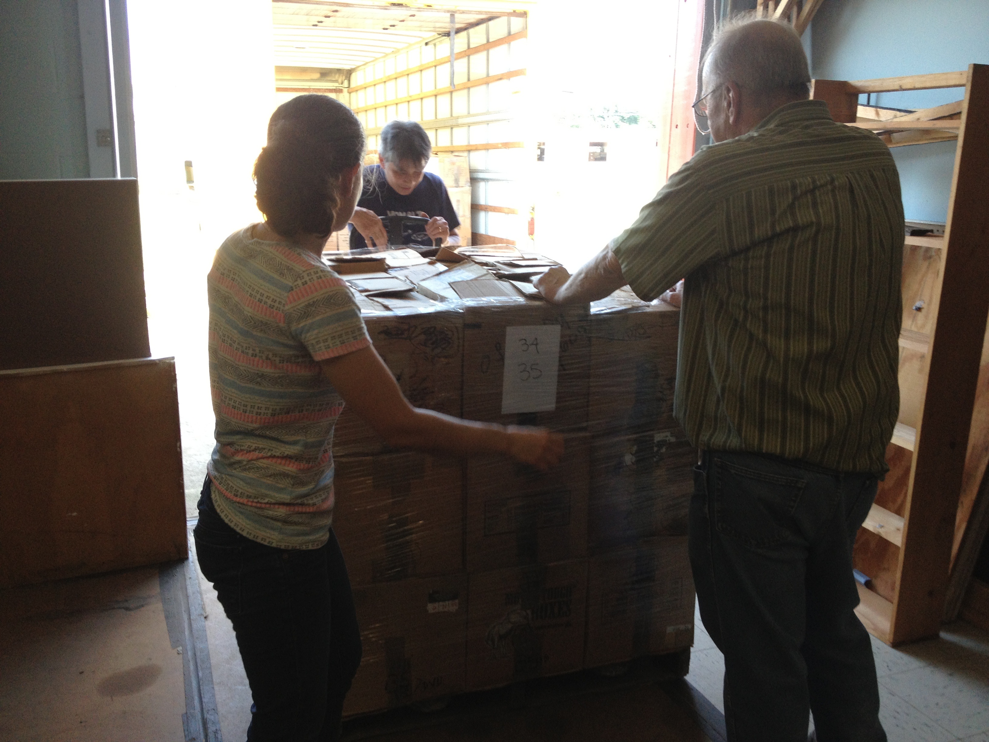 In preparation for Round Up, we moved 40 or so pallets to our new warehouse space. (And a good thing we did too, as we really needed the space for all the new-to-us books and records and puzzles and games that came in on Saturday.) It takes a small army to keep the Foundation running– and though we got a picture of Larry Outstanding in His Field, we forgot to take more pictures until the very end of the day, when we loaded the last 11 skids of the day– and Allison, Brian and Elmer were the last here–Â ’till the very very end. We love them.